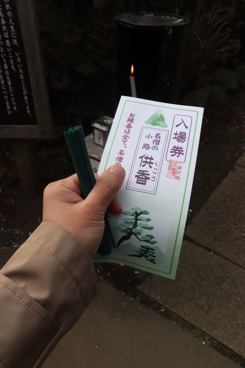 お線香をコース内に建立された昔の名僧の像の前にお供えして回ります。